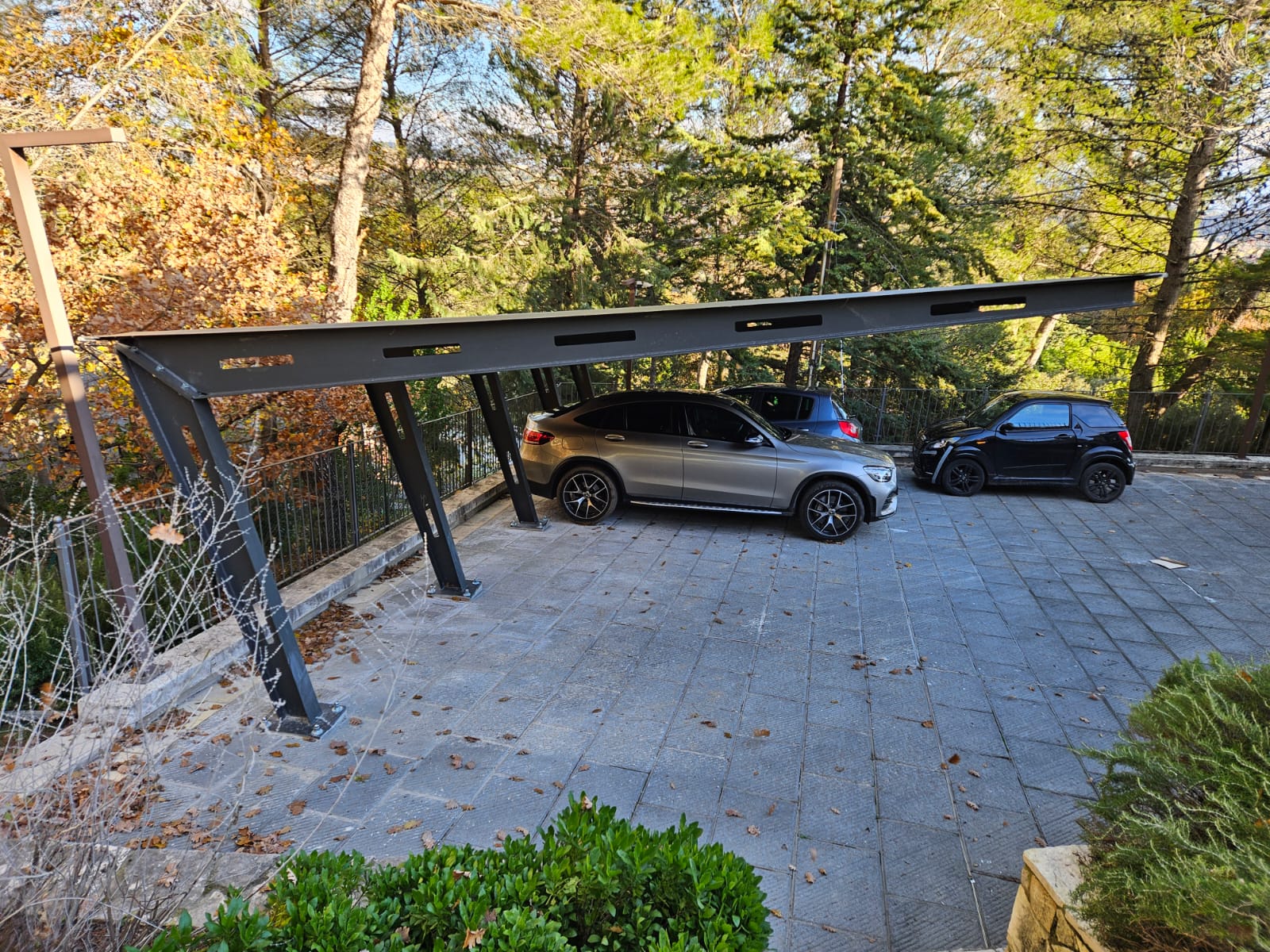 – A SBALZO, con un unico supporto alla base che permette di non avere ingombri nell’area di manovra e nella zona di apertura sportelli. Le misure standard sono: 5,0 mt circa in profondità (che permette di alloggiare 3 pannelli da 1600×1000) e un interasse di 5 mt (due posti auto);